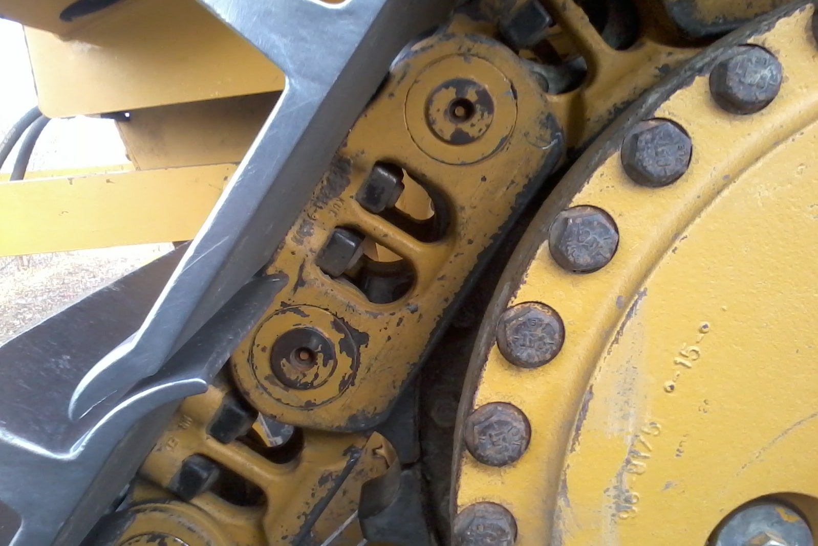 On the Caterpillar D6, D5, and D4 high drive, the drive is built with a larger outer flange to hold the gear carrier. The outside of the track link will run between the outer flange and the sproket drive. The link has a clearance of about .75 inches between the bottom of the link and drive hub. When working in moist soil, snow, or mud the soil or material packs in the void area and forces the link to flex when running around the drive sprocket. The material will keep packing up and will allow the drive sprocket to skip in the link and shock the drive gears internally and premature failure occurs.